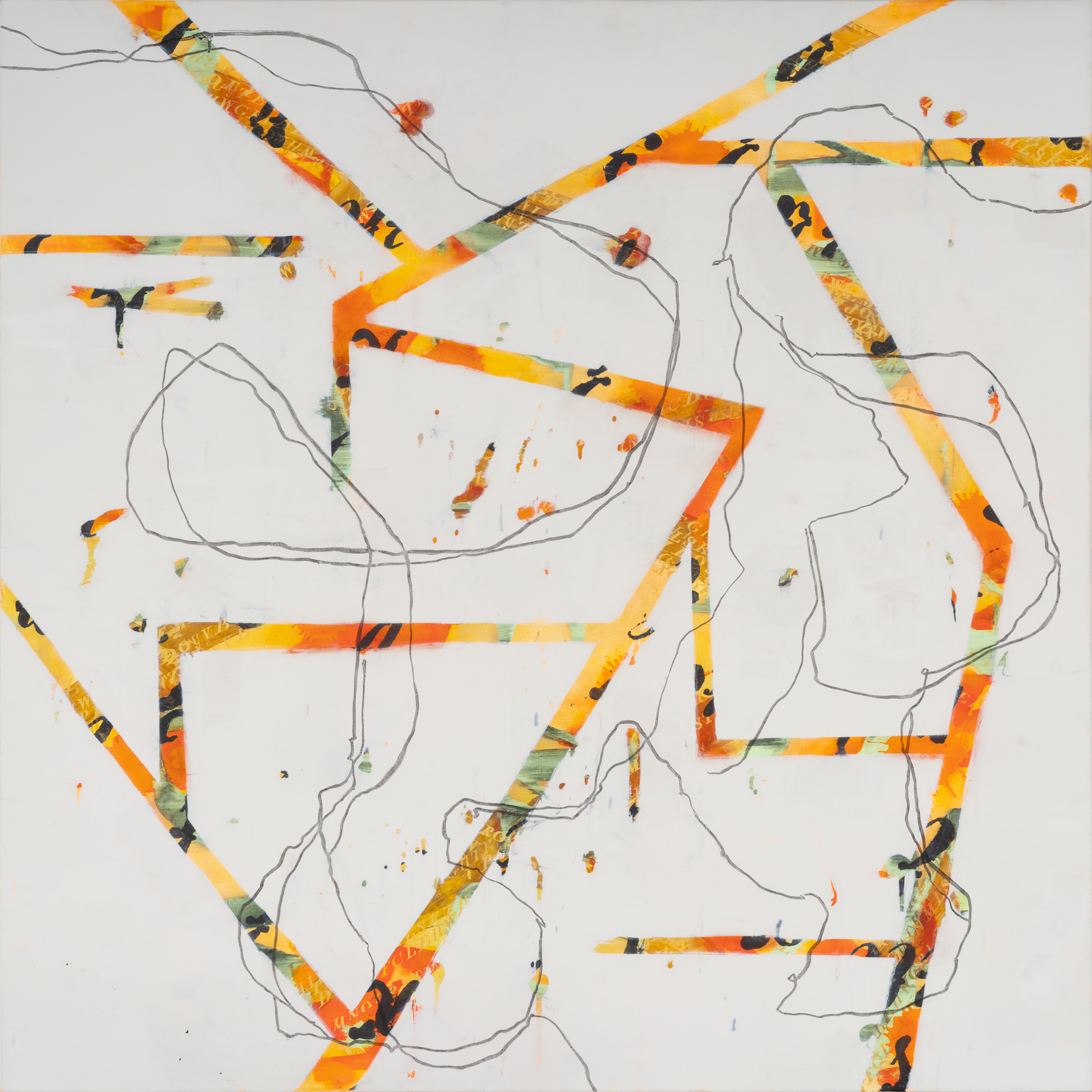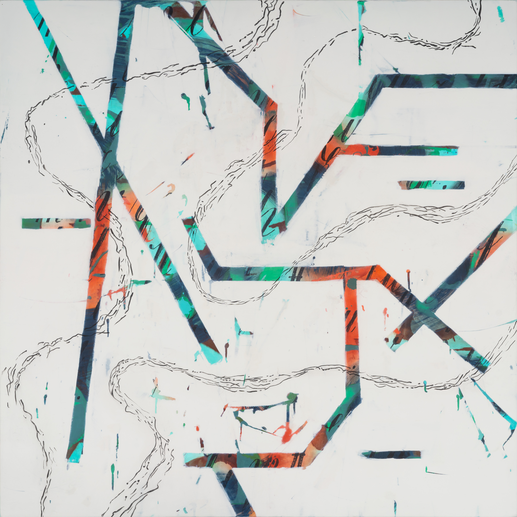 Wild migration is to Catherine Courtenaye a quasi-mystical phenomenon that inspires her recent work above all else. With their map-like views, her paintings employ an abstract language for communicating the dissonance between wildlife movements and human infrastructure. Subdivisions, highways, and fences—expressed through the rectilinear patterning in the paintings—are increasingly disrupting the ancient routes of wild movement. Vibrant colors and intricate details of the geometric bands evoke the nuanced complexity of human history over time, from ancient indigenous footpaths to superhighways. The bits of black text that peek through to the surface of finished paintings symbolize language and culture. On the uppermost layers, curving lines reference the migratory movement of animals such as elk, pronghorn, and mule deer.